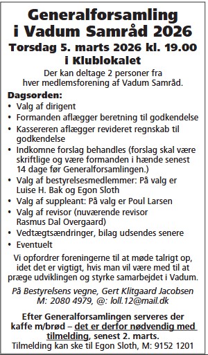 Indkaldt via Vodskov/ Vadum Avisen her: Indkaldelse til Generalforsamling Vadum Samråd